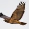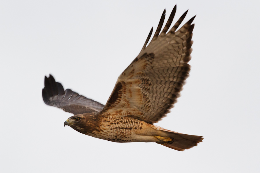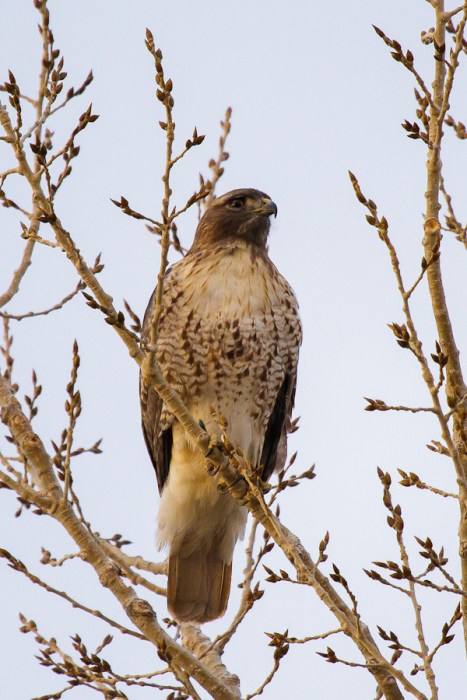 In addition to the eagles, which are a fairly rare sight around these lakes busy with human activity, there were a number of hawks around. There was a Cooper’s Hawk out in one of the fields that is usually a cattail marsh during spring and fall. It was off a ways, too far to get a decent shot. There were also a couple of Red-tailed Hawks hunting around the lake. I managed to get a few good shots of one of them. The featured image of this post and the shot below are of the same rather beautiful bird. (The exposure is pretty terrible as the sky was a light, overcast gray, which doesn’t make for a great bird photo on any day):
