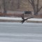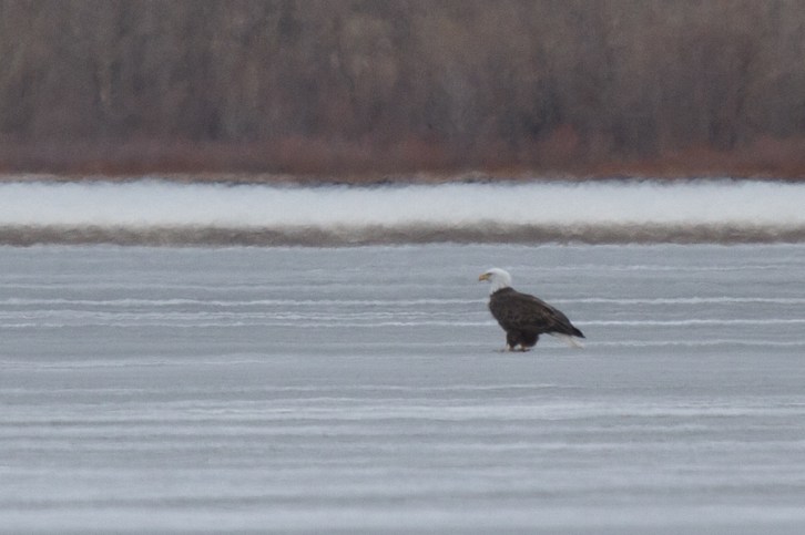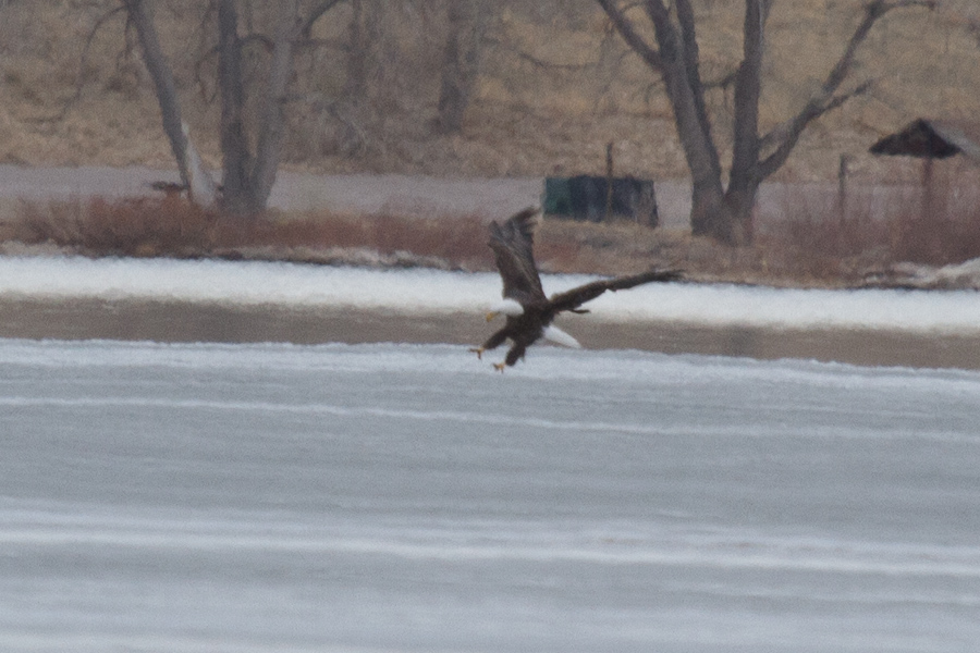 I believe there were some Wild Mallards and Northern Shoveler’s as well flying around, but they zoomed by faster than I was able to handle and never seemed to land on the lake. The bald eagles were hanging out pretty far out on the ice, near the middle of the lake. I managed to get a few shots of one of them from a very great distance. The shots here are considerably cropped, and sublimating water from the lake ice created quite a haze, so don’t look for quality in these shots. (The eagles, what seemed like two bald eagles and one golden eagle, looked like small brown spots on the lake as far as my own eyes could tell…while they were still too far to get a useful photograph with my camera, it sees better than I do and the photos were good enough for identification. The bird I believe was a golden eagle flew off before I had a chance to get a shot.)