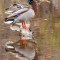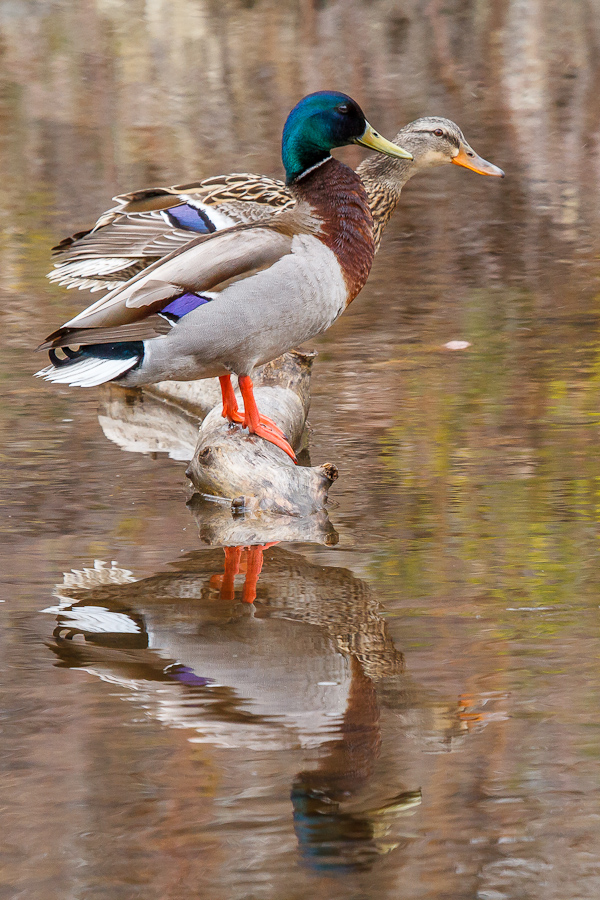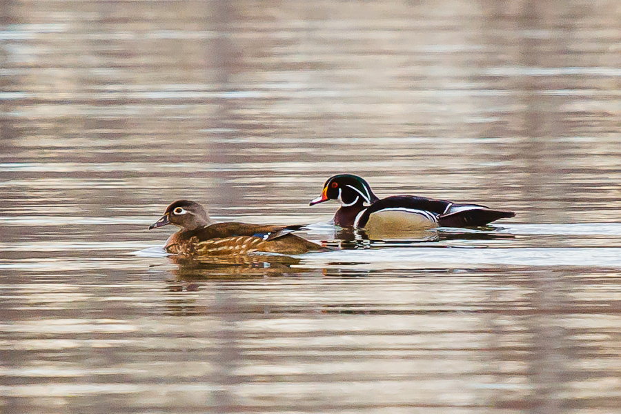 Along this initial hike, I could hear a bird that I could only catch a few glimpses of. It was fairly small, dark blue, and had a fairly distinctive call. At the time I wasn’t sure what it was, however a little searching after I got home indicated it was a Belted Kingfisher. This was another bird I really wanted to photograph, particularly with a catch…but I could really only hear it, and the few times I did get some photographs it was high overhead silhouetted against the relatively bright sky. The trail I was headed down wound alongside one of the inlet rivers of the riparian area south of the lake, and ducks were lazily meandering up and down. They were always careful to stick to the far shore when they spotted me, however one couple, a drake and his gal, were obliviously preening away on a log: