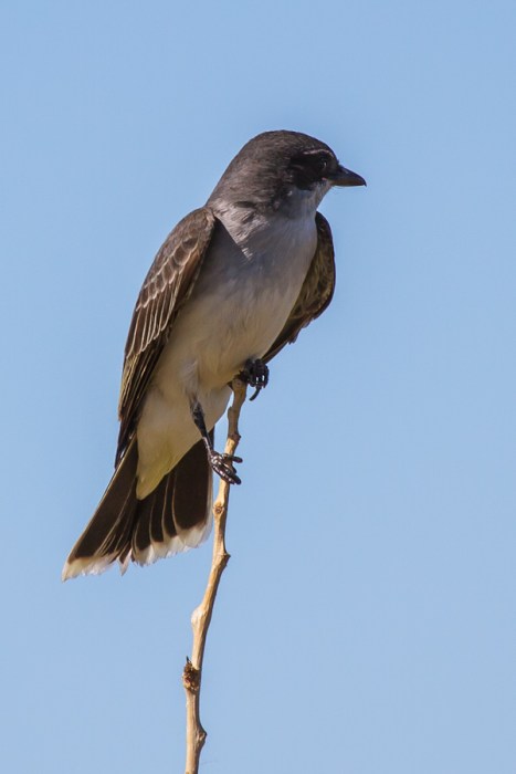 The first birds I saw after hauling my camera out of the car were the Kingbirds, in this case Eastern Kingbirds. Dark on top, light gray on bottom, they filled all the newly planted trees lining the wetlands area. They would hang out on a branch eyeing the sky for a meal, then dart out, often performing rather amazing feats of areal acrobatics to catch their prey, then head back to their perch. There must have been a dozen of them at first, although over time they seemed to spread out more around the wetlands, and some of the areas, due to the recent heavy rains, were unreachable from flooding. One Kingbird in particular gave me quite a number of excellent poses and photographs.