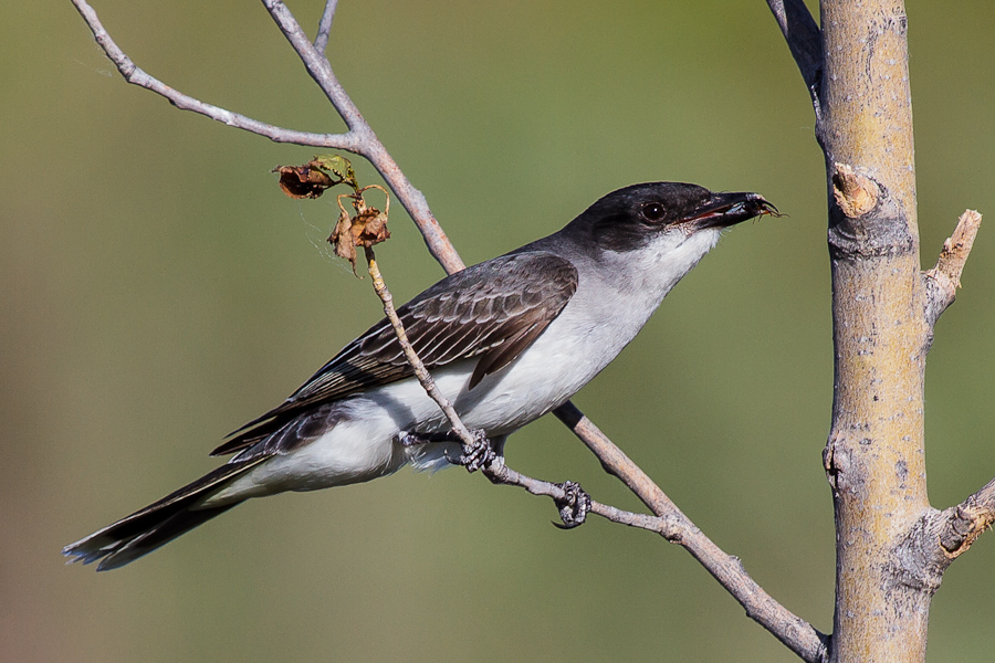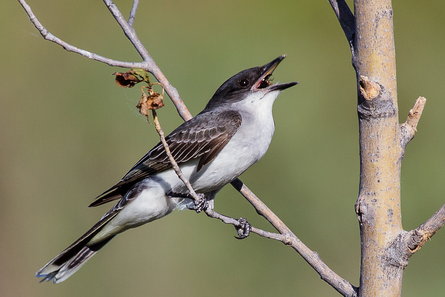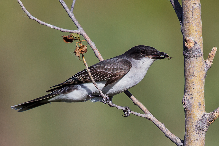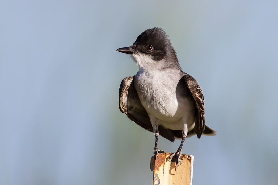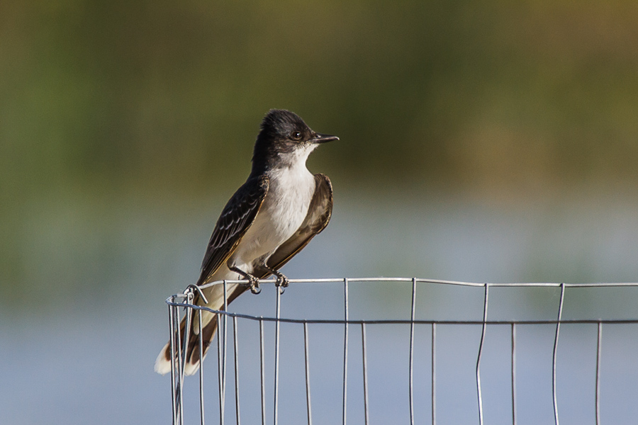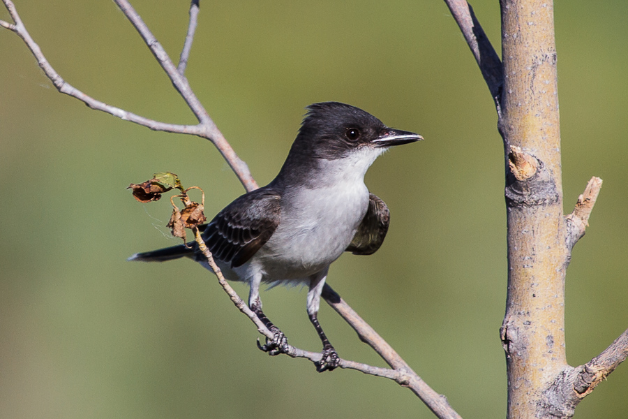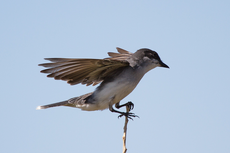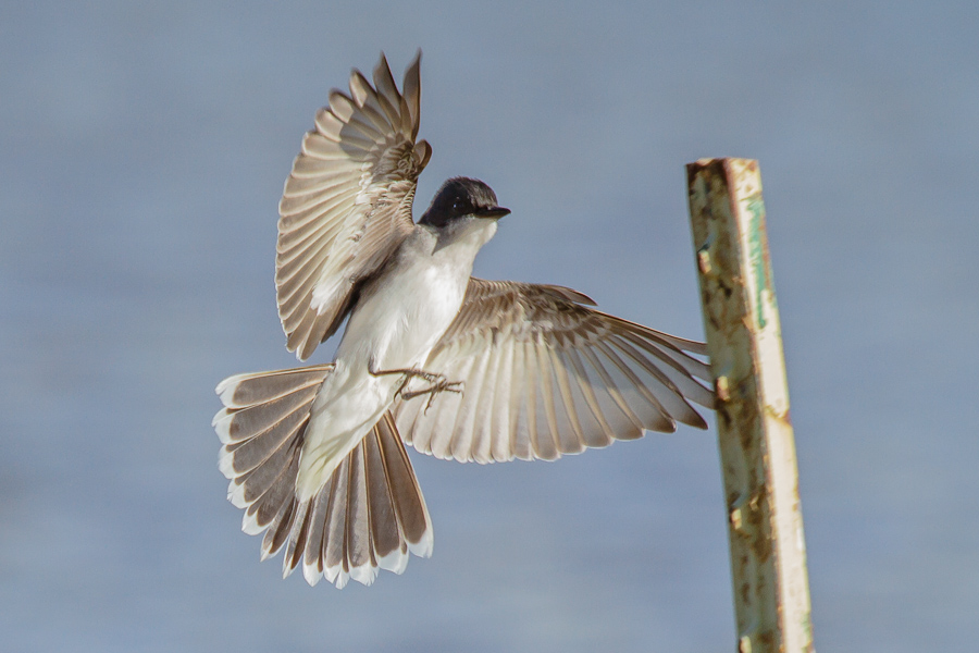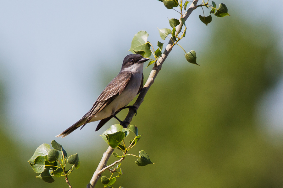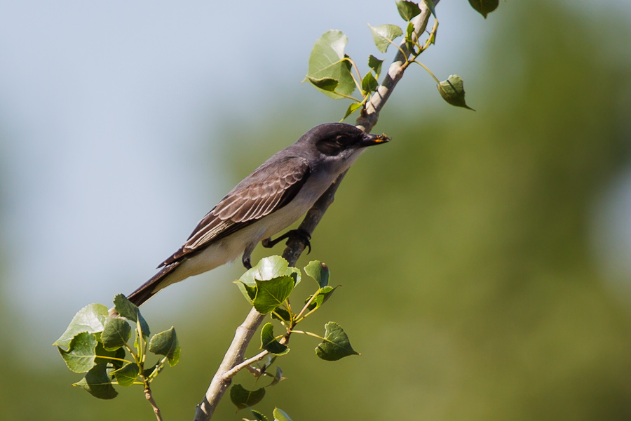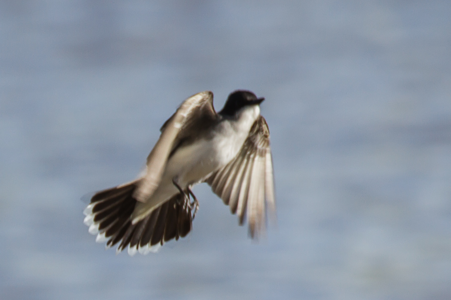 I love the little plum of feathers that tufts up over their head when they are being particularly observant. I also like how their wings are always perched at the ready, so they can fly off at a moments notice. Gives these birds a significant part of their character. I kept trying to catch them while they were in flight. I’d zero in on one when it was perched, and try to track it from the moment it jumped off its perch to catch a bug in flight. As a side note, I think one of my favorite bird shots that I’ve taken so far is the first one below here…Kingbird on a Branch. I love this shot…compositionally its great with the diagonal branch, the green leaves nicely compliment the green and light blue boke on the background. Its all nice and sharp, too!