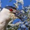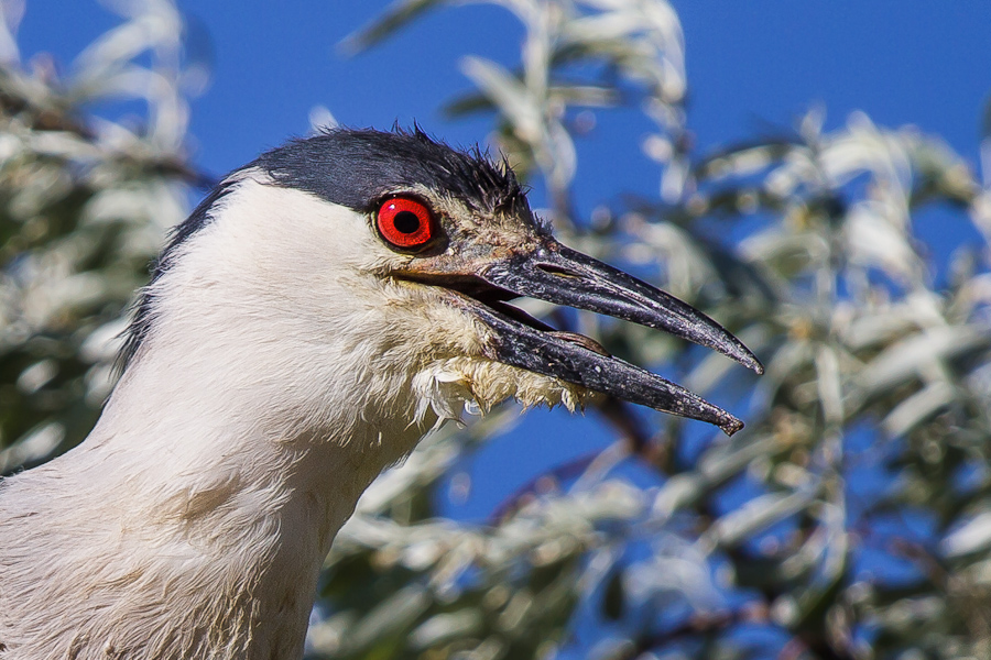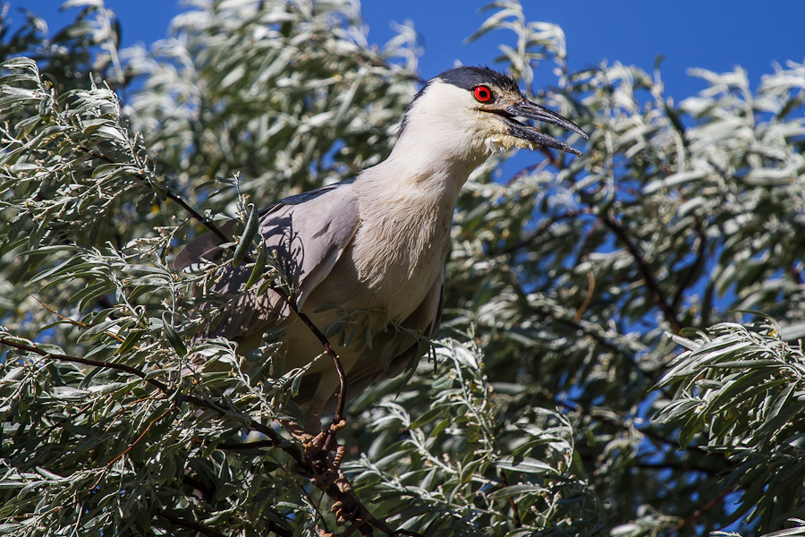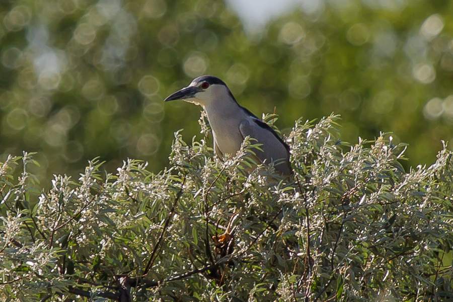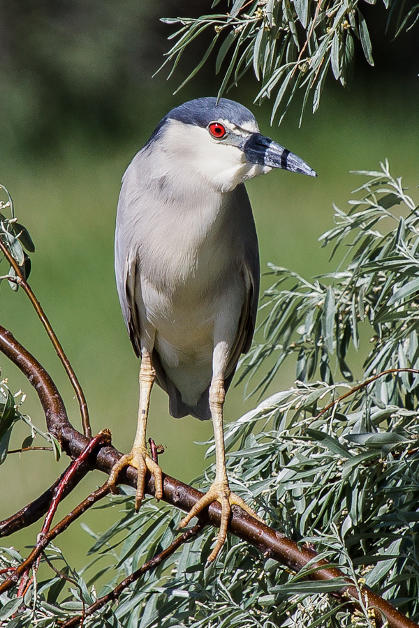 In the mean time, as my attentions had turned to the water, it turned out that one of the Night Herons had circled around, and landed on one of the trees overlooking the pond. I heard a scratchy, throaty call, and slowly looked up to see a brilliant, ruby-red eye staring down at me from a very close distance. Night Heron’s are not the largest herons by far, but up close with fiery-red eyes they are momentarily intimidating. I managed to capture a few shots of the beauty before it took flight, however it simply circled again and landed only slightly farther away, offering another photo opportunity. I count the shot below as rather lucky, a full-body pose with a nice, softer background.