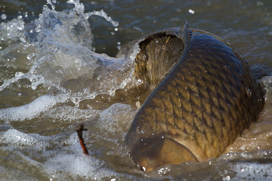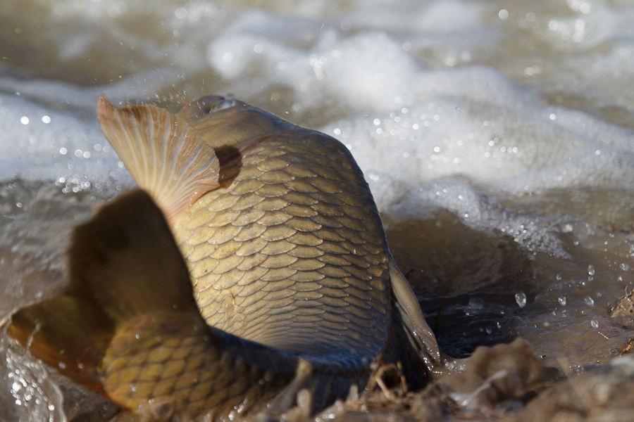 For some odd reason, the fish seemed to be trying to swim back up the outlet of the flow regulation system that was pumping water from the wetland into the pond, which was sending water north into the reservoir. These rather large, 18-22″ fish would race towards the gushing outlet, only to fly past it onto the bank, then flop their way back into the water. I had a hard time getting any decent pictures of this event, as each time it I heard a splash it was already too late to catch a flying fish. I did catch a couple shots of flapping, flopping, slithering fish as they wriggled back towards the water.