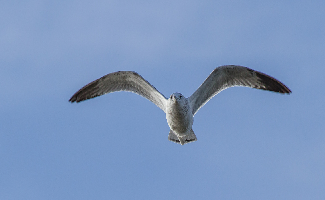 | 3 imagesJust a few gulls in flight. At least one is a Ring-billed Gull. I think one is a Herring Gull. The other, with the lighter background, I’m not sure about. It might be a juvenile California Gull in a late stage of its second year. The bill is really what’s throwing me off…I don’t yet know enough about identifying bird species to figure out how that light colored bill and ring with a yellow spot fits into the huge variety of juvenile gull morphs there are.
