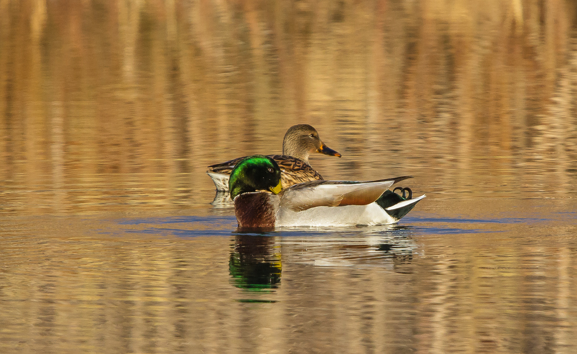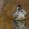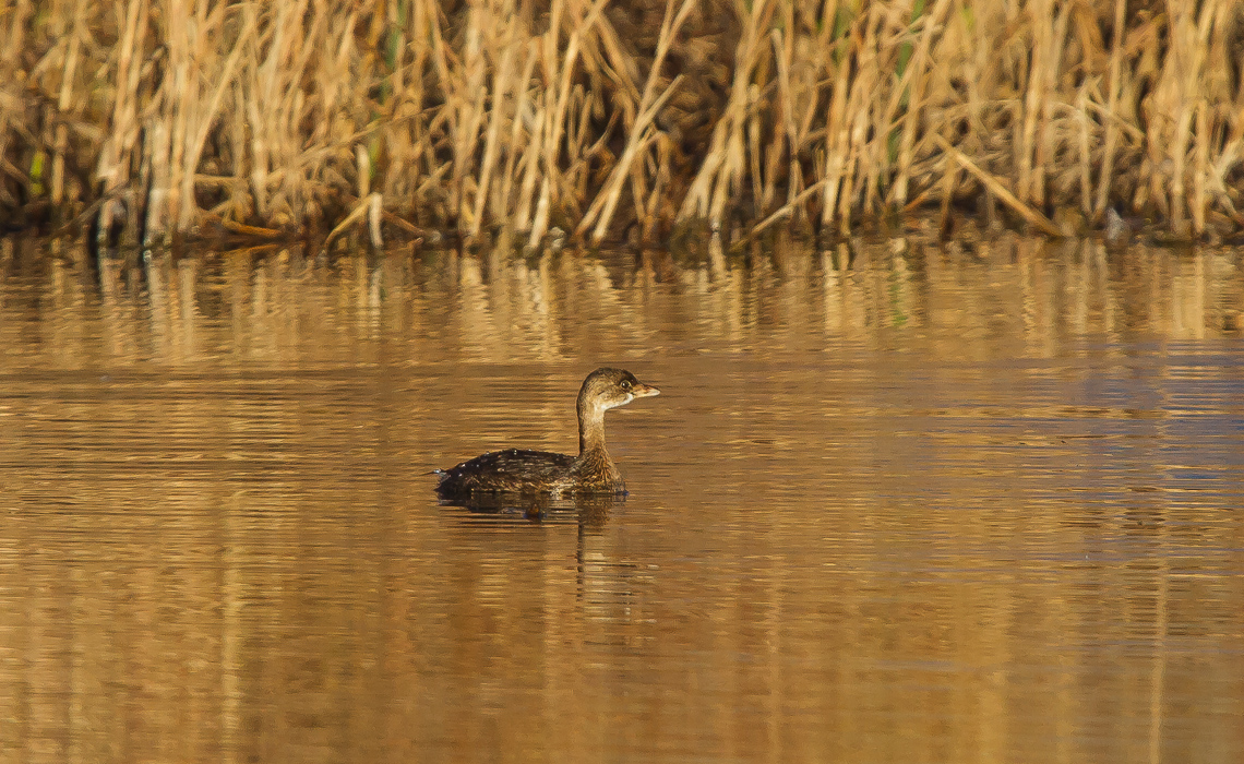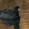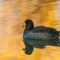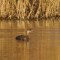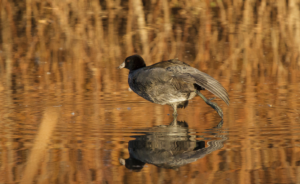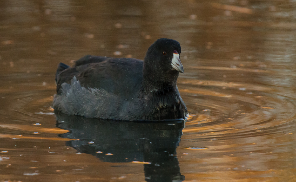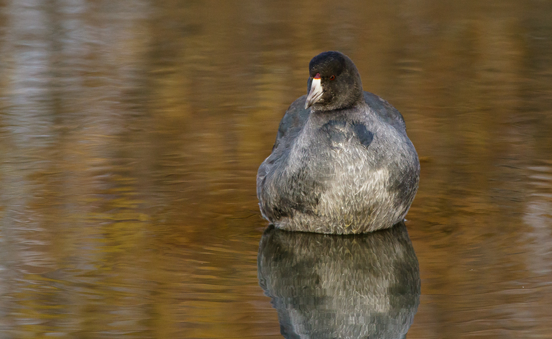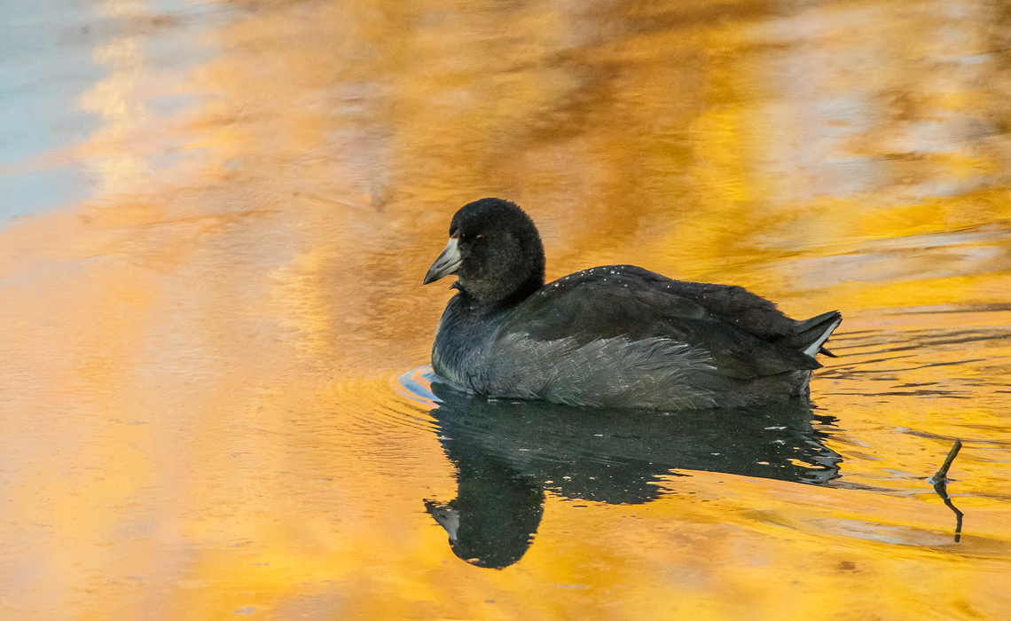 The photographic opportunity, with late fall reflecting in the waters from everywhere, offered me a chance to get some interesting shots. The featured photo of this gallery is that fat coot drifting through perfectly glass-clear water reflecting a dull gray sky shortly before sunset…the only shot of the day that did not have golden, orange, yellow, or brown reflections in the water. Sadly, I was in very low light conditions, and my ISO was quite high, so there is not much in the way of fine feather detail.
