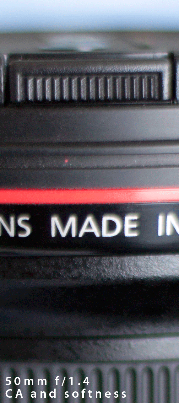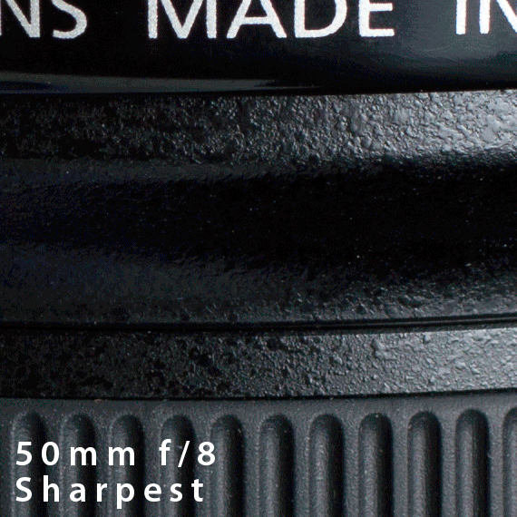 The animated GIF image below demonstrates the effects of aberrations and diffraction from the Canon EF 50mm f/1.4 USM lens. The EF 16-35mm f/2.8 L USM is used as a subject, as it has great detail and clean, sharp edges around text. The 50mm lens has an aperture range of f/1.4 to f/22. The animated GIF cycles through all of the major aperture stops. The most important comparison to make is f/22 vs. f/1.4…the difference is huge, and strongly in favor of f/22. Another key comparison to make is f/22 vs. f/2.8. While f/2.8 does not exhibit nearly the same degree of aberrations as f/1.4, slight color fringing is still evident around the white lettering. The lens does not reach its “sweet spot”, the point where optical aberrations and diffraction are at their relative minimums, until f/8! Even at f/5.6 some fringing from chromatic aberration can still be seen. By f/11 and through f/16 and f/22, the sensor is “diffraction limited”, however take note that IQ is still better than most other apertures except perhaps f/8, and possibly f/5.6.