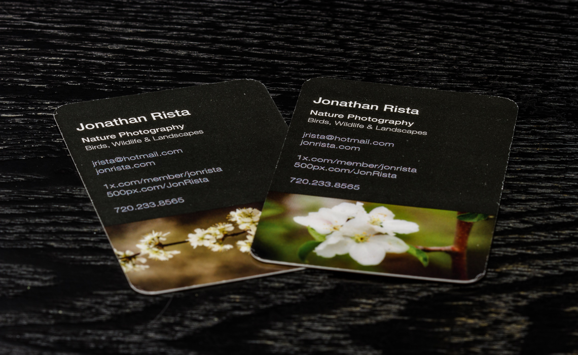 | 2 imagesI received these a couple of weeks ago. They look pretty good, however the glossy finish seems to be a little problematic…it cracks along the edges, and flakes off the surface under even a little abrasion. I still have to do a bird set, and I’m going to use the matte finish for those ones. (I’ve had some moo cards with the matte finish before, and they are very nice.) Anyway, thought everyone might like to see what my business cards look like. Aside from the cracking/flaking issue, I think they look nice. If I ever need to have them reprinted, they will definitely be matte finished as well.