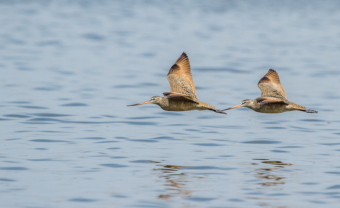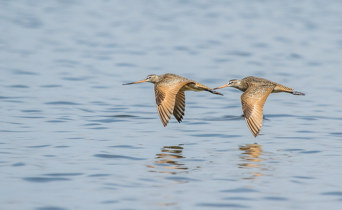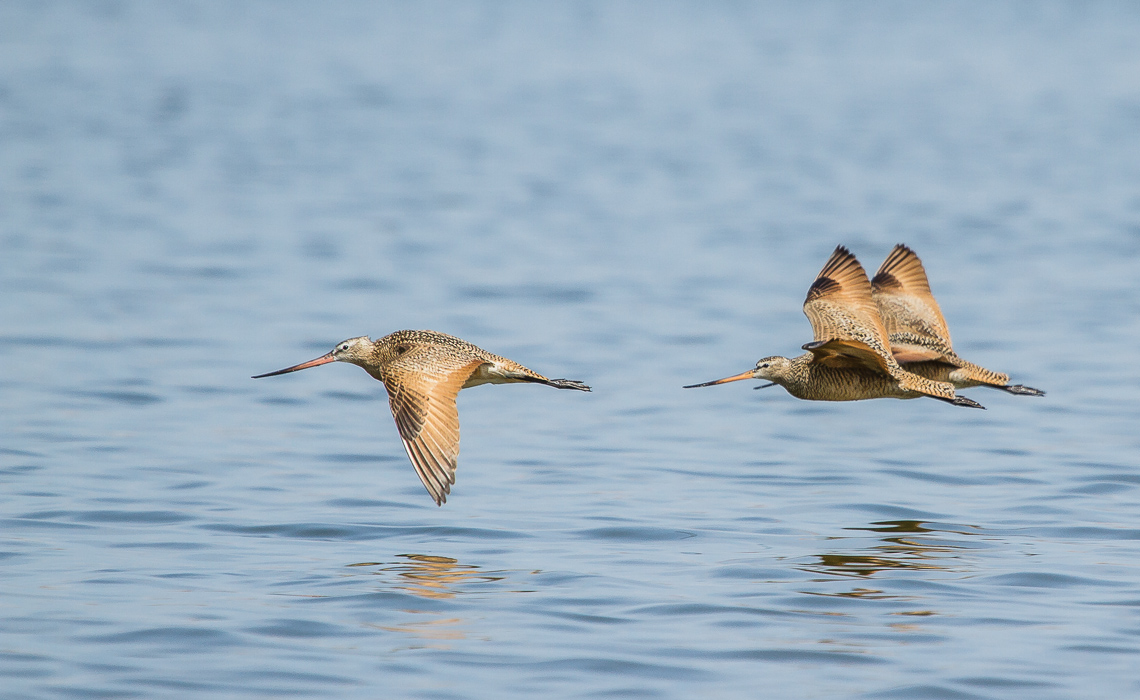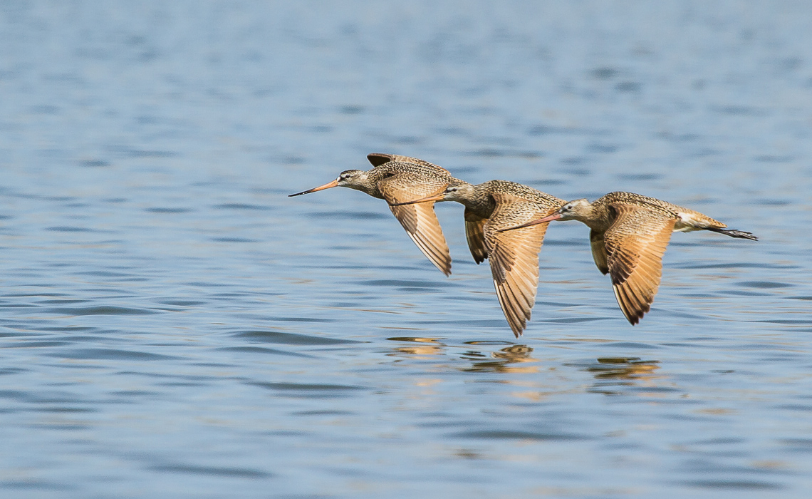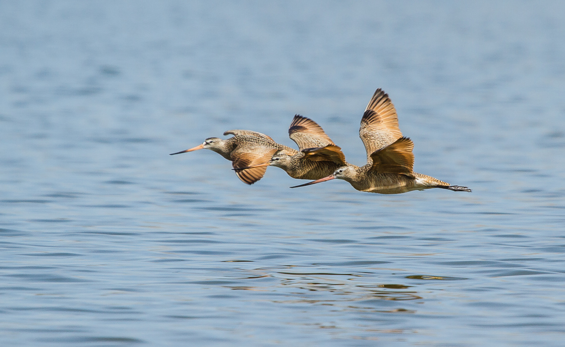 | 6 imagesWhile photographing the shorebirds a week ago, a trio of Marbled Godwits were startled from their hunting grounds. The three flew by in formation, presenting an amazing opportunity to get some great in-flight shots. It can be tough getting shots of shorebirds in flight…they startle on a dime, and when they do, they usually take off very quickly, before you have a chance to frame and photograph them. If you do, they are usually flying away from you. I was a ways down shore from where the Godwits were hunting, which gave me time to zero in on their flight trajectory, lock focus, and get some amazing shots. The third shot and last shot of this sequence are my two favorites, I think.