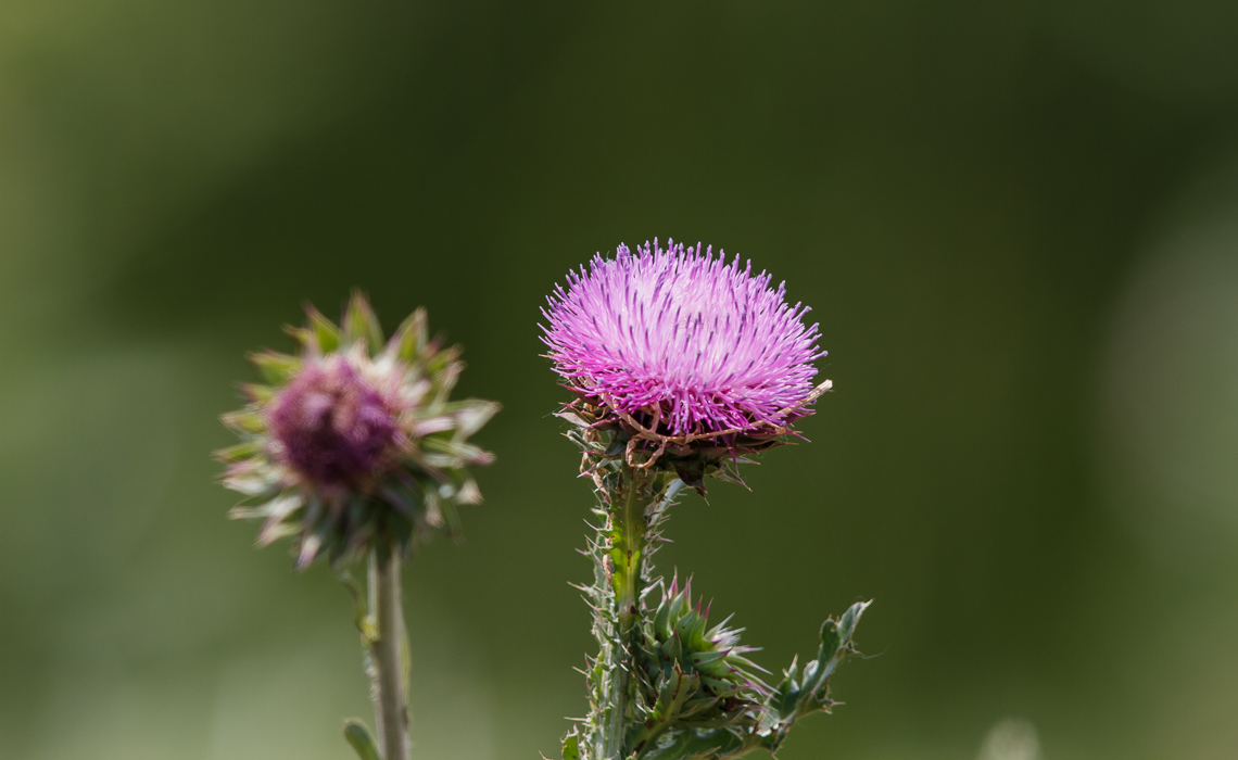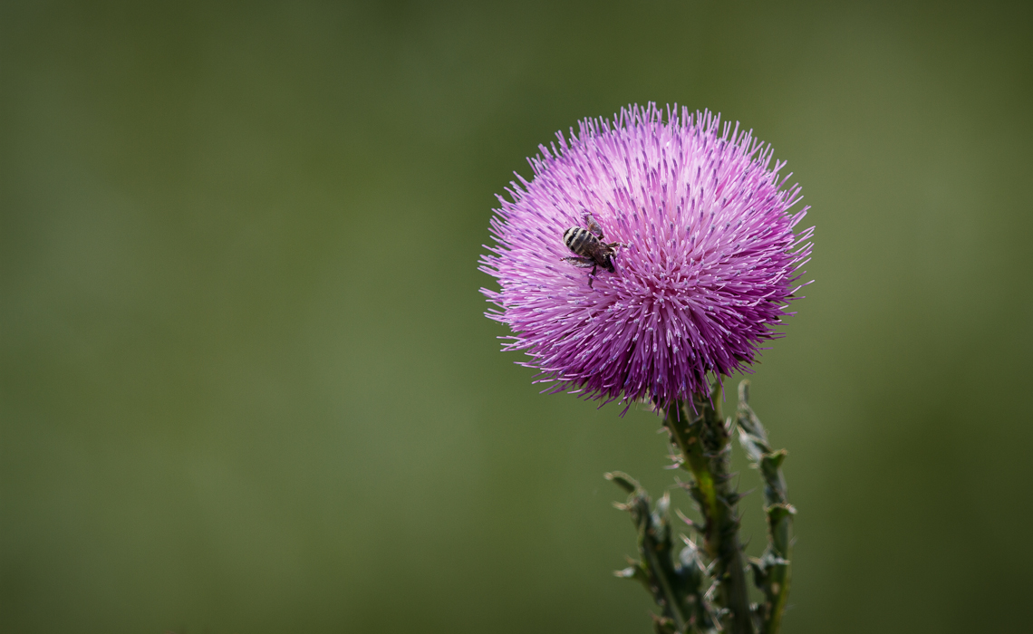| 3 imagesWhile out with my new lens today, I stopped to get a couple of photos of some beautiful thistle in full bloom. For as ugly and painful as thistles get in late summer and fall, in my opinion they do have one of the most beautiful flowers. The ones I found today were quite large, over two inches in diameter, some maybe over three inches. The vibrant clusters of purple glow vibrantly in the sunlight, too…attracting hoards of insects for pollination. There were at least half a dozen varieties of fly, two types of bee, lady bugs, and some kind of insect I couldn’t identify. Some of the flys had these amazingly patterned and iridescent eyes…one of which seemed to like the upper knob on my gimbal as a perch. He seemed to follow me around, as every time I looked at the knob…there he was, keeping a close compound eye on me. 😉