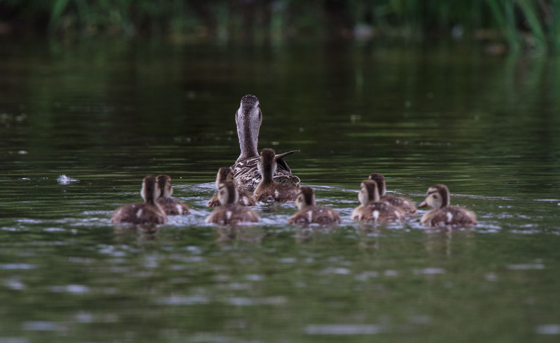 | 2 imagesWhile out at Cherry Creek a couple days after I received my new lens, I accidentally scared off a group of well-hidden Mallards that were resting on one of the Cottonwood shores. Along with them was a mother with a fairly large group of ducklings (I counted a total of nine). Unused to the very thin depth of field this 600mm lens has, most of my shots did not really come out…most of the ducklings were blurry. These two shots, however, came out well enough to share. I like the first, where the little duckling is riding on his mom. 🙂