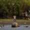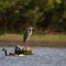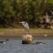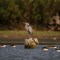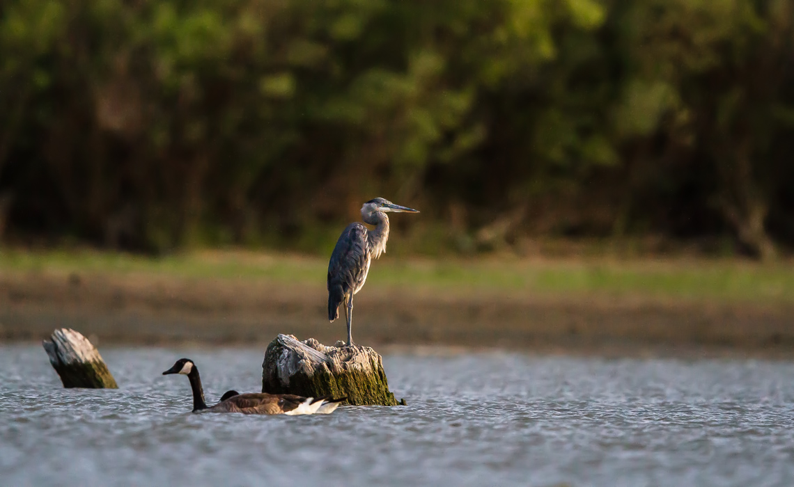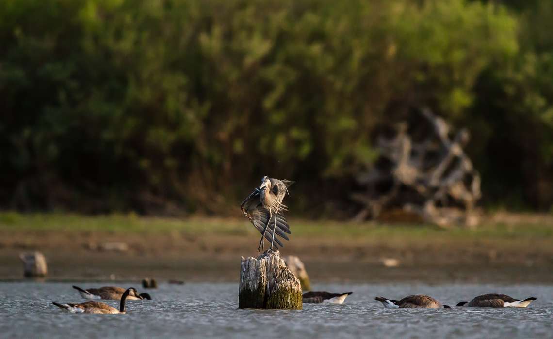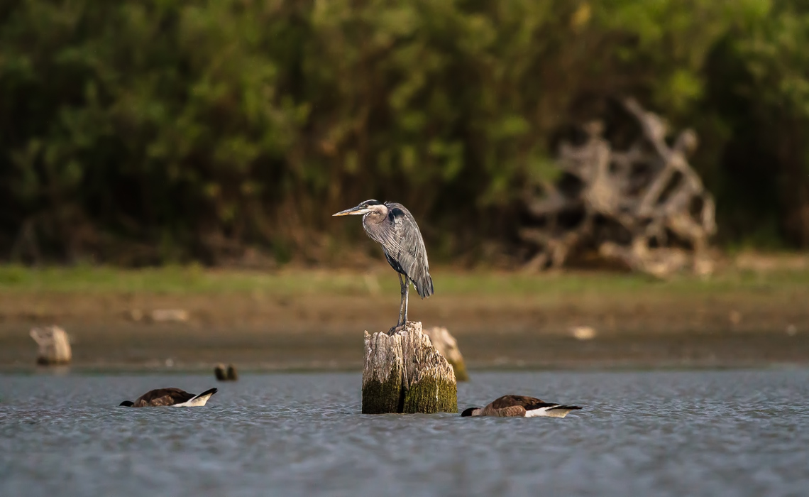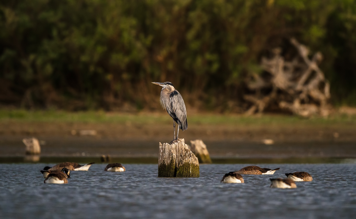 Well, my stupidity…and perseverence…paid off in the end. The four photos here were captured as the sun dipped below the far edge of the storm that hovered over the Rockies. The orange glow did not last long, but it created some wonderful lighting, and highlighted three Great Blue Herons that were having a relaxing evening. Each one had its own moss-covered stump that was sticking out of the water…surrounded by what I thought was rocks at first. The herons were fairly distant (but hey, not too distant for 840mm! :D), so I couldn’t see them all that clearly. After a while I noticed that the “rocks” were slowly moving, and every so often a long neck would pop up…Geese! As the herons basked in the sun, the geese were apparently having their dinner all around…