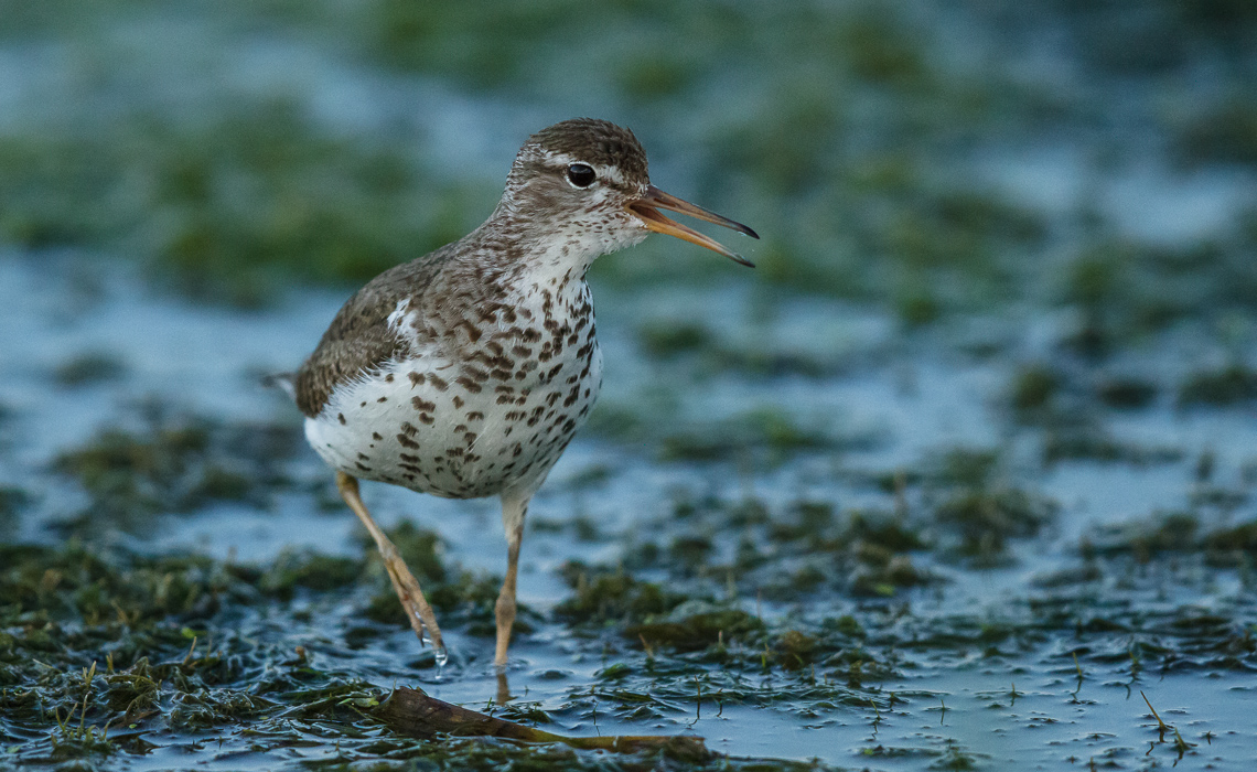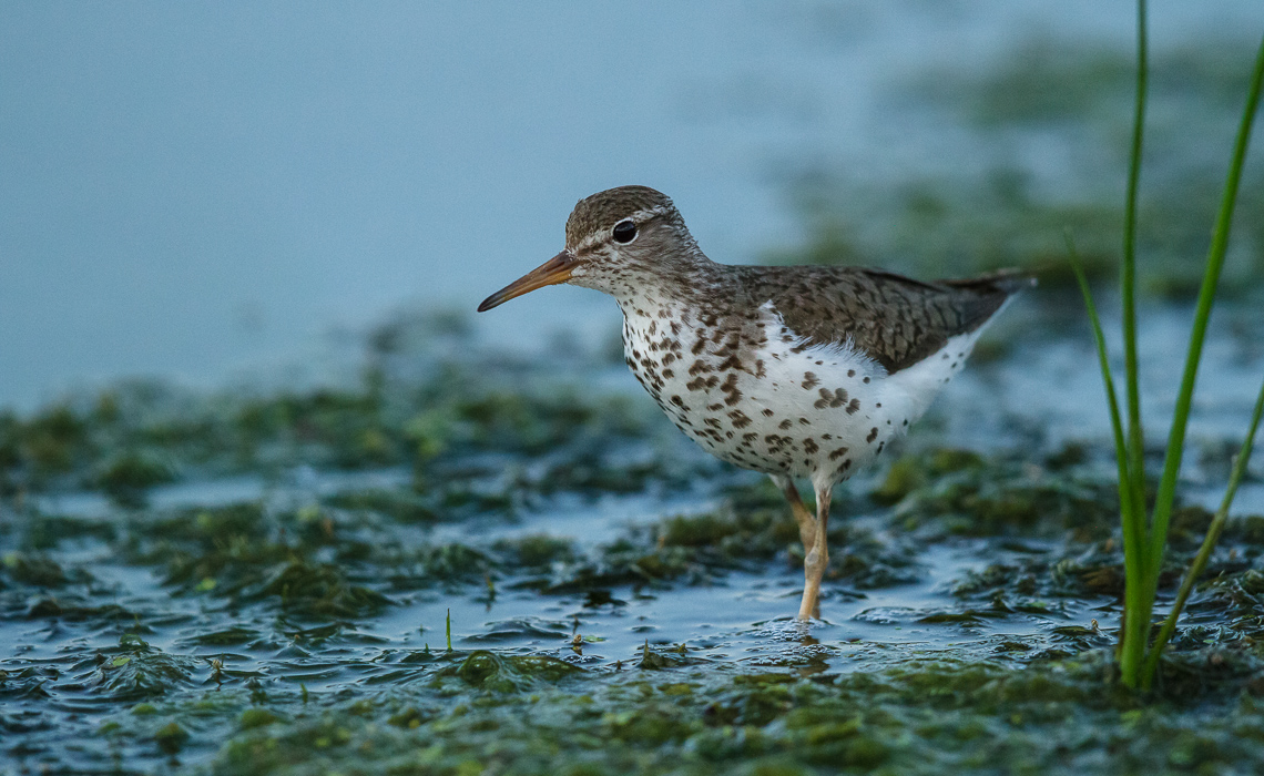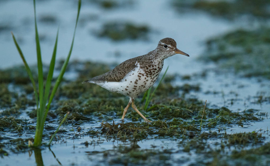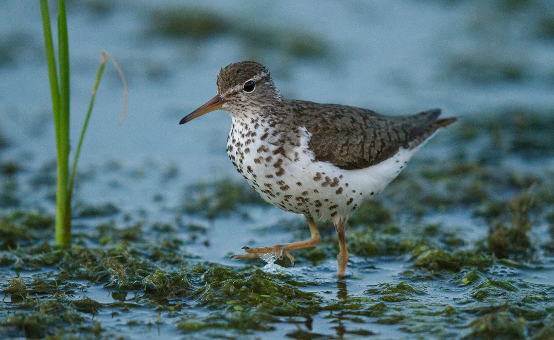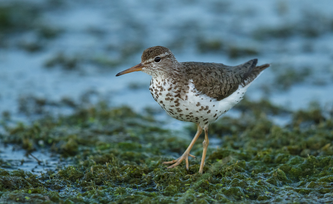| 13 imagesFurthering the defensive excursion from before, I stuck around after sunset to photograph the aggressive little Sandpoper daddy. He was definitely protecting a nest or his mate, at the time I was unsure which. If I moved away from the shore after him, then towards the shore, he would fly out and perform his little display out on these big mats of pondweed. I really liked the green and blue balance, and he was rather funny trying to walk on this marshy, mushy mat that didn’t really behave all that well as a performance platform.