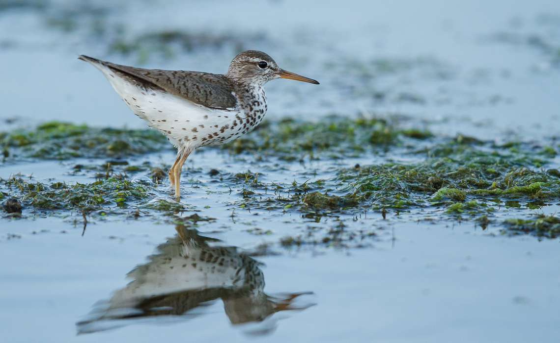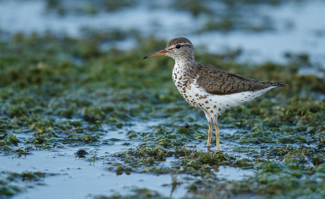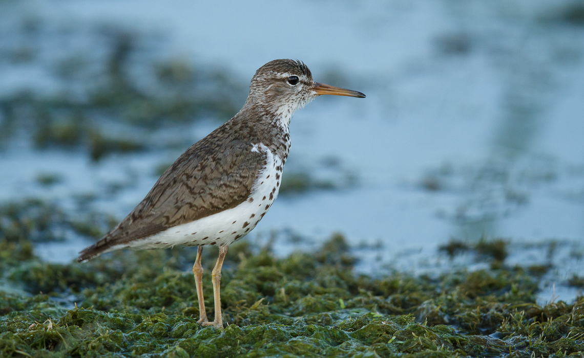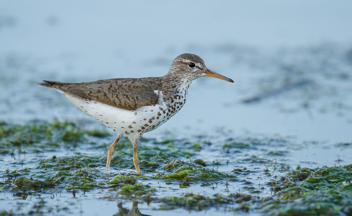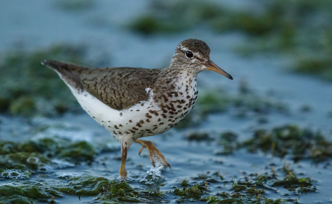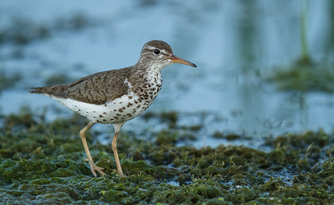 | 13 imagesFurthering the defensive excursion from before, I stuck around after sunset to photograph the aggressive little Sandpoper daddy. He was definitely protecting a nest or his mate, at the time I was unsure which. If I moved away from the shore after him, then towards the shore, he would fly out and perform his little display out on these big mats of pondweed. I really liked the green and blue balance, and he was rather funny trying to walk on this marshy, mushy mat that didn’t really behave all that well as a performance platform.