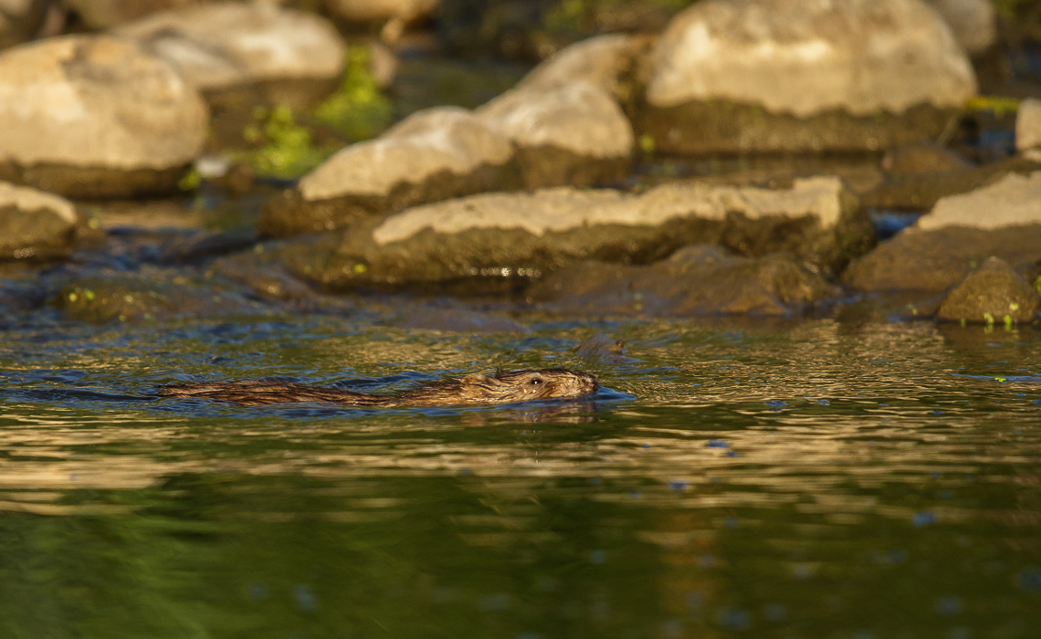 In this case, my somewhat hidden vantage behind some shore vegetation while I sat on some rocks out in the creek gave me a chance to observe and photograph them without them seeming to know I was there. While the heron seemed quite dismayed with their presence, and pecked and jabbed at them a couple of times, they obliviously went about their business…which seemed to be chopping down reeds and hauling them upstream. (Most of this activity was captured in a couple of short video clips, which I seem to have misplaced. If I can find them again, I’ll upload to Vimeo and link here.) Eventually, the chubby muskrats decided to forage downstream a bit, and slithered through the small cascade and almost right on top of me before they decided to head back up and mess with the heron some more…who promptly decided it wasn’t worth the effort to stick around any longer.
