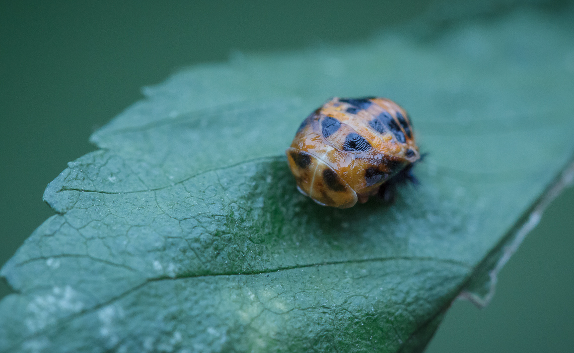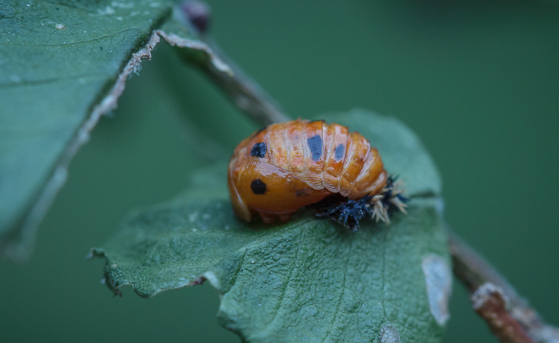 A couple days after the original discovery, I found a couple large larvae attached to some leaves, apparently preparing to pupate. I clipped the branch, and dropped it in some water, and I have been watching it for the last couple of days. The average time to pupate for a ladybug is about five days, so hopefully in a couple more days, I’ll have some interesting hatching and elytra hardening photos to go along with these pupa shots.