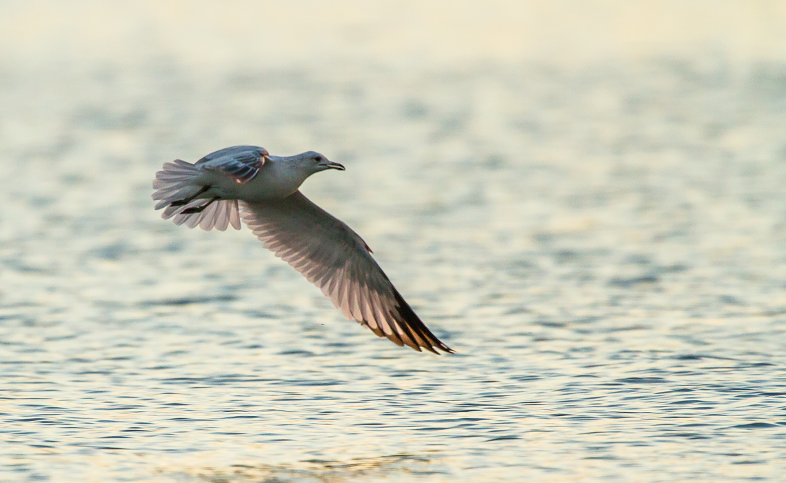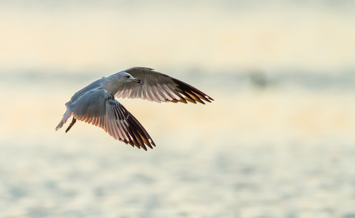 Well, as it had turned out, I forgot to import one batch of those photos, and they were still on a memory card. I have a whole bunch of CF cards, and sometimes one or two will sit around for months after I forget to plug it in and import and process everything on it. I periodically go through all my CF cards, import anything off of them that I had forgotten to import, and clear them out so they are ready to go. I had about five CF cards sitting about with a lot of old stuff on them, including these Gulls in Flight shots from that same day. Most were unusable, however a few turned out to be great backlit shots of gulls in amazing in-flight poses. With some heavy shadow recovery and careful highlight tuning, and some heavy noise reduction, I was able to salvage a number of these photos…two sets of three. Personally, I prefer the first (lighter colored) set, but I like the faint reddish deep sunset glow of the gulls wings in the darker colored set.