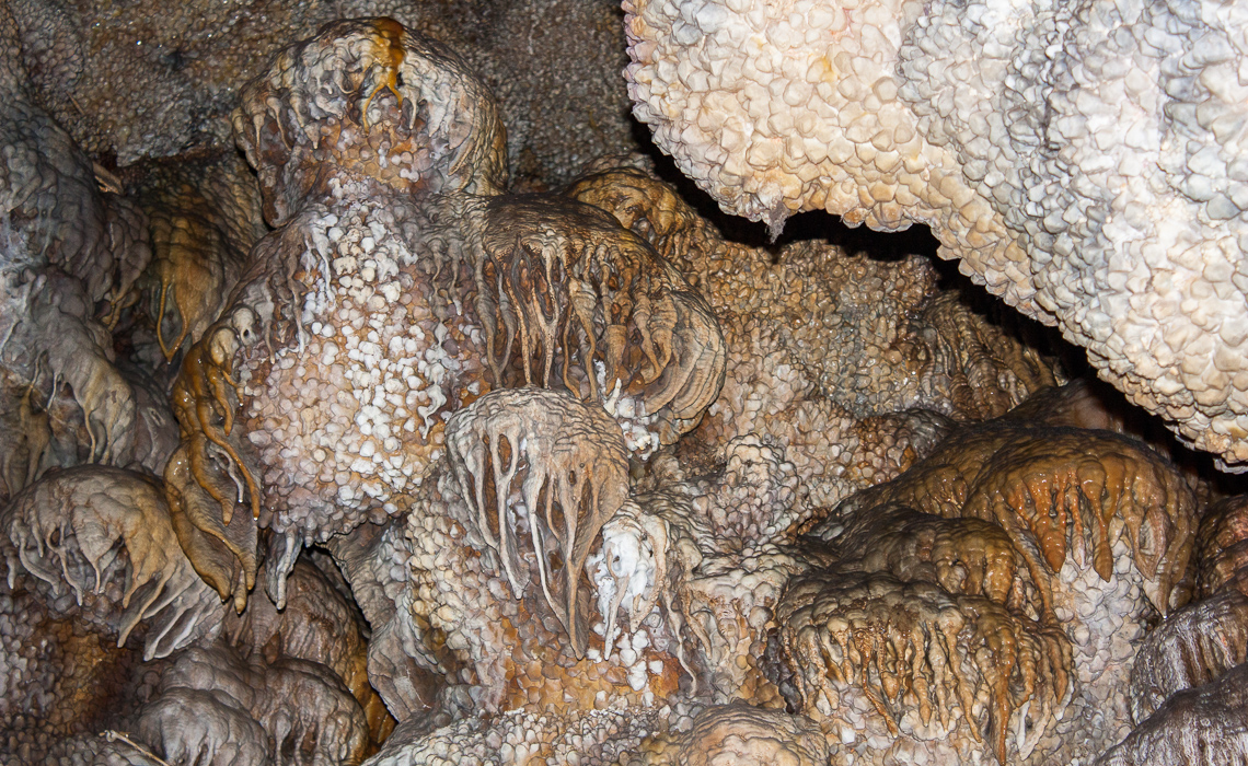 Wind Cave was the first cave we visited. Wind cave is huge, it completely covers an area of one square mile, reaching down to depths as deep as several hundred feet. Additional exploration has found arms of the cave that reach beyond the one square mile area, and there are countless unexplored squeezes that could ultimately lead to caverns and passages that extend for many square miles. The tour we took demonstrated one of Wind cave’s more unique features: Boxite. This calcite formation reached into cracks in sandstone, which was later weathered away during a submersion stage of the cave. That left boxite behind, the thin waxy-looking plates as pictured above. Another interesting facet of Wind cave is the fact that it has one single natural entrance. That results in an interesting pressure dynamic, where external pressure results in wind rushing into the cave system through this one small hole, and where external pressure drops result in wind rushing out of the cave system through the same hold. Hence the namesake.