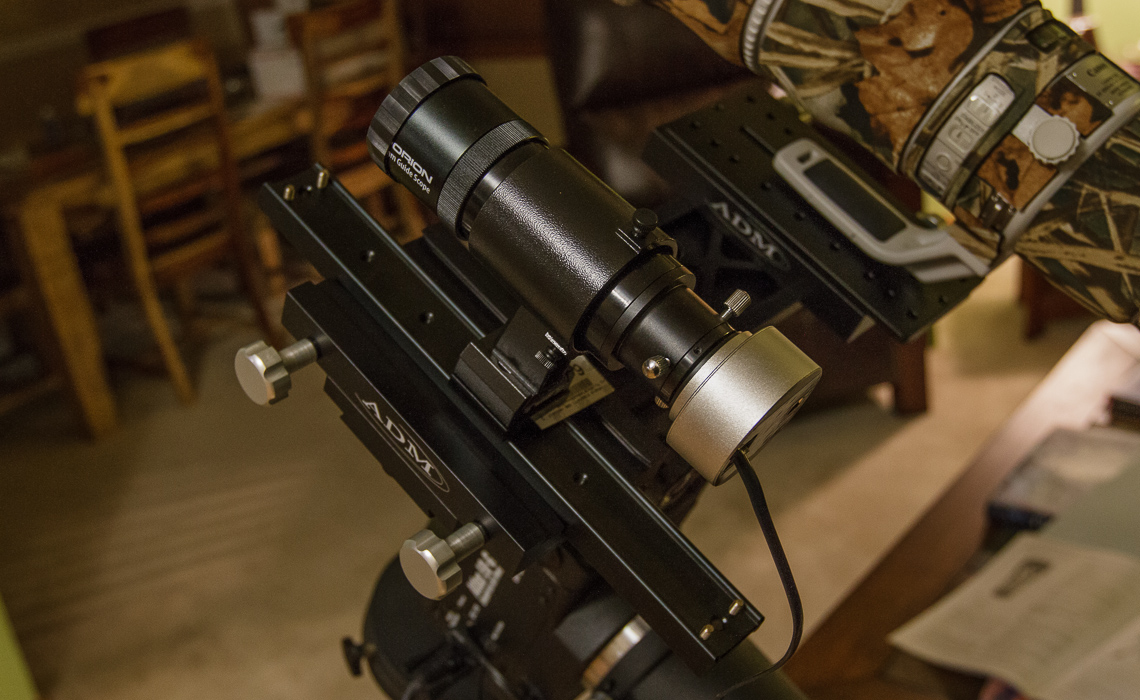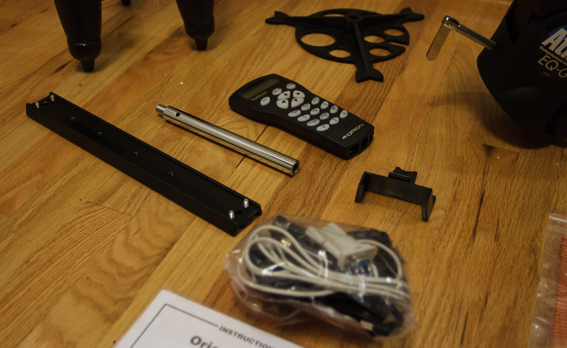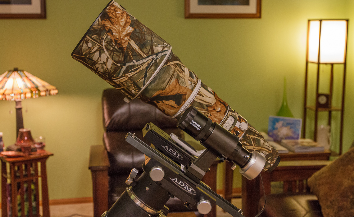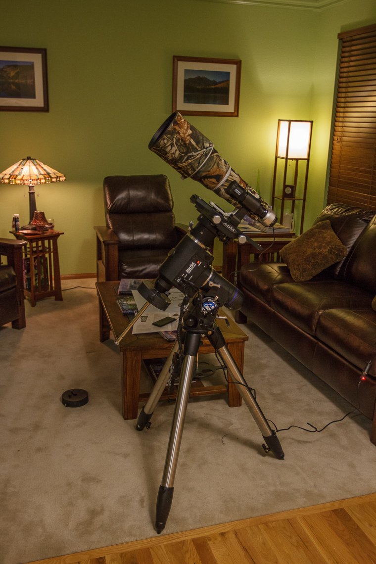 Apparently, a sort of right of passage when you buy any telescope equipment is that the sky clouds over, and you have to wait, tongue-biting, often for weeks, until the sky clears at night so you can actually get outside and start using your fancy new equipment. Well, seems as though I’m going to be biting my tongue for the next couple weeks at least before we get clear skies for an extended duration at night. I will need at least a few hours to get my setup aligned with the north celestial pole, fine tune that alignment, and start learning how to image a DSO. Such a night is not due to come along until some time in March given long term weather forecasts. So, until I have a chance to actually do some real imaging, here are some pictures of the new equipment, and my lens configured as a telescope!