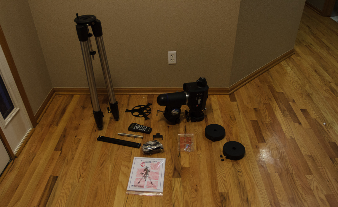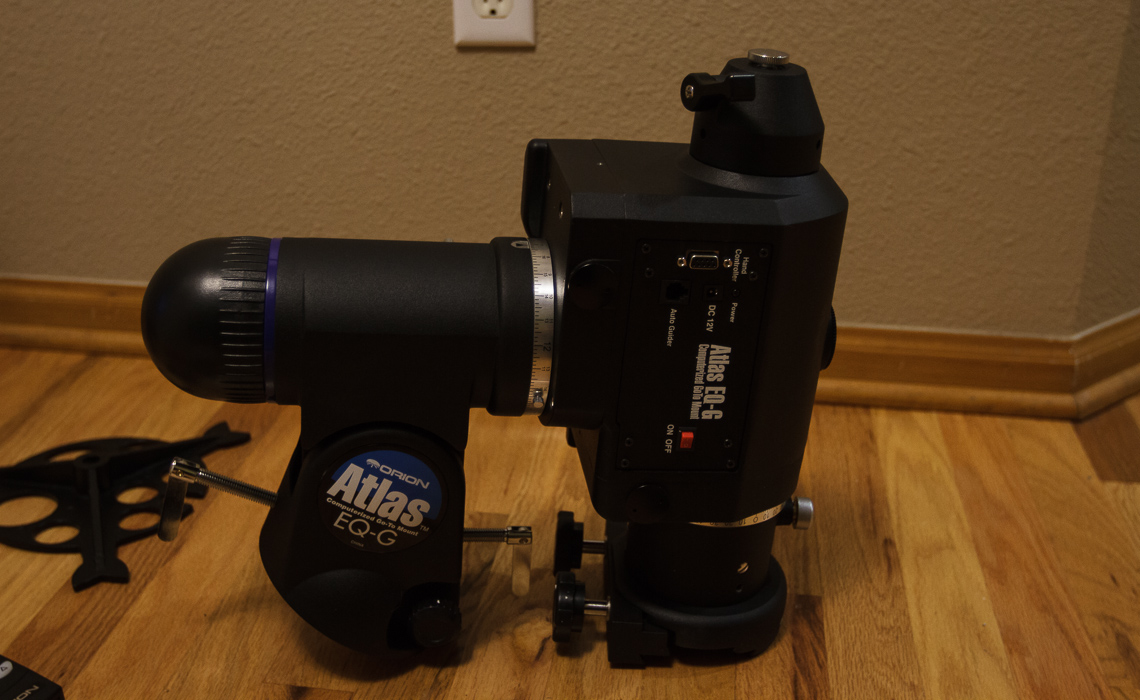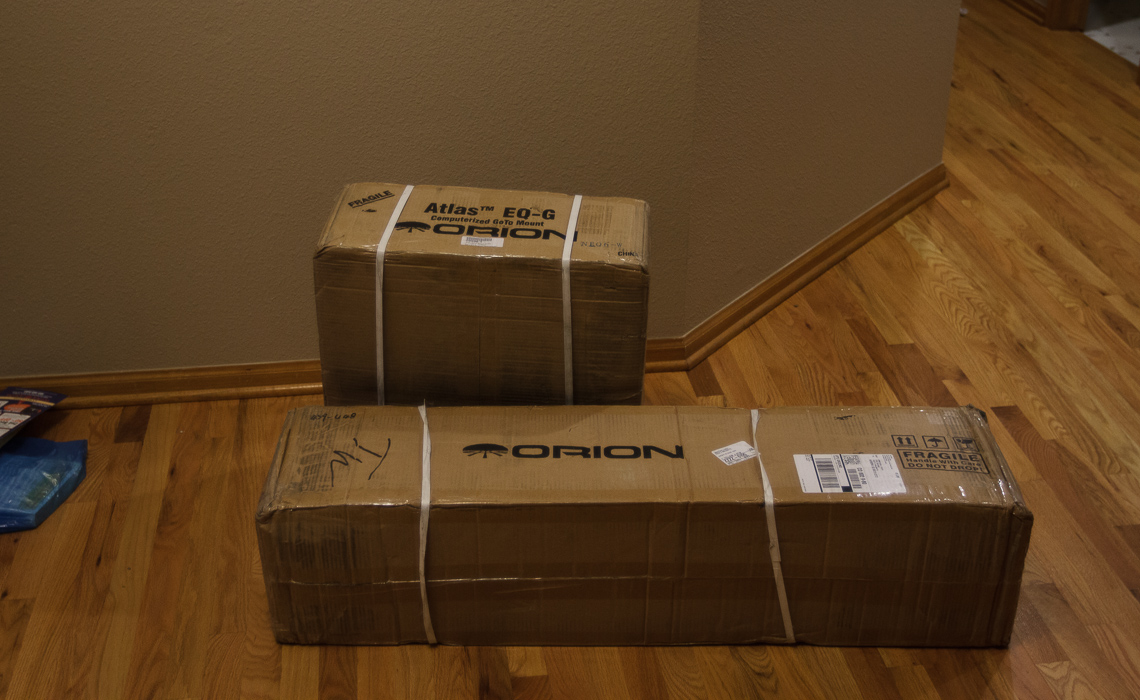 A couple weeks ago, I ordered an Orion Atlas EQ-G german equatorial tracking mount (computerized GEM or tracking GEM). Unlike your average photography tripod, a GEM is huge. The whole setup without a telescope attached is 54 pounds. The tripod is quite massive, with 2 1/4″ aluminum tubing that makes my already rather large Gitzo GT3532LS look kinda small. The Atlas EQ-G equatorial head itself is quite large. Large, but very solidly built, smoothly operating, and more than capable of handling telescopes up to 8-10″, and certainly the “telescope” I’ll be putting on it.