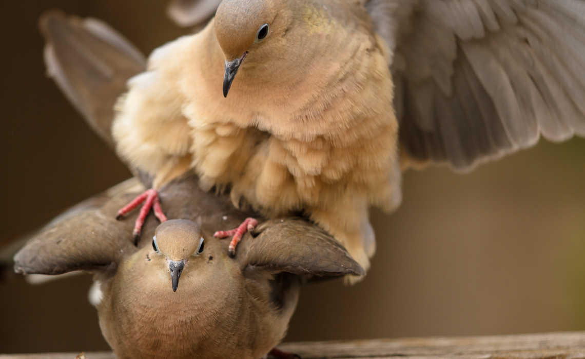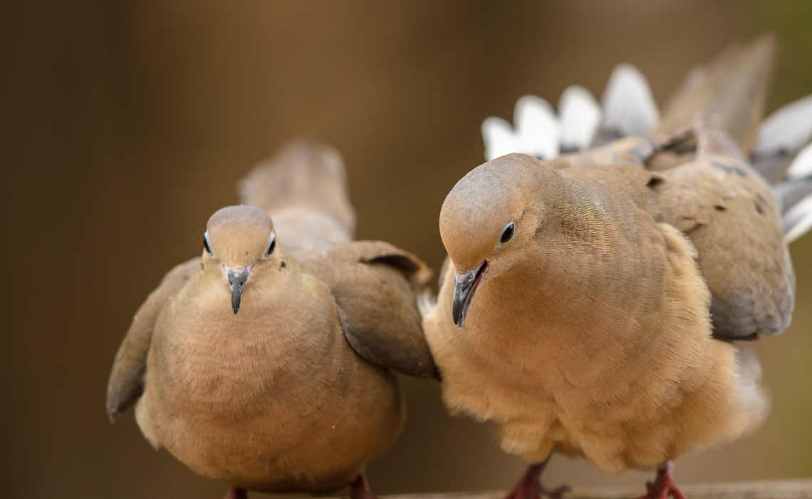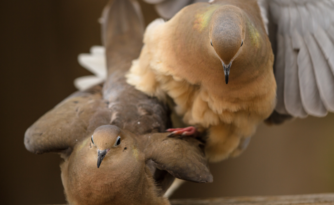 | 13 imagesA little over a week ago (oops, forgot to post!), I heard a “cooing commotion” outside my sliding door to my deck. The back of my house gets lots of bright, direct sunlight, so I have attached a dark blanket over my light white and largely translucent covers over my sliding glass door. I wasn’t exactly sure what was going on…thought at first that a couple male doves were squabbling. I grabbed my lens and camera, supported it against my door sill, and slowly pulled the blanket back just enough so the front of the lens could poke through, without revealing the photographer behind…and I started shooting.