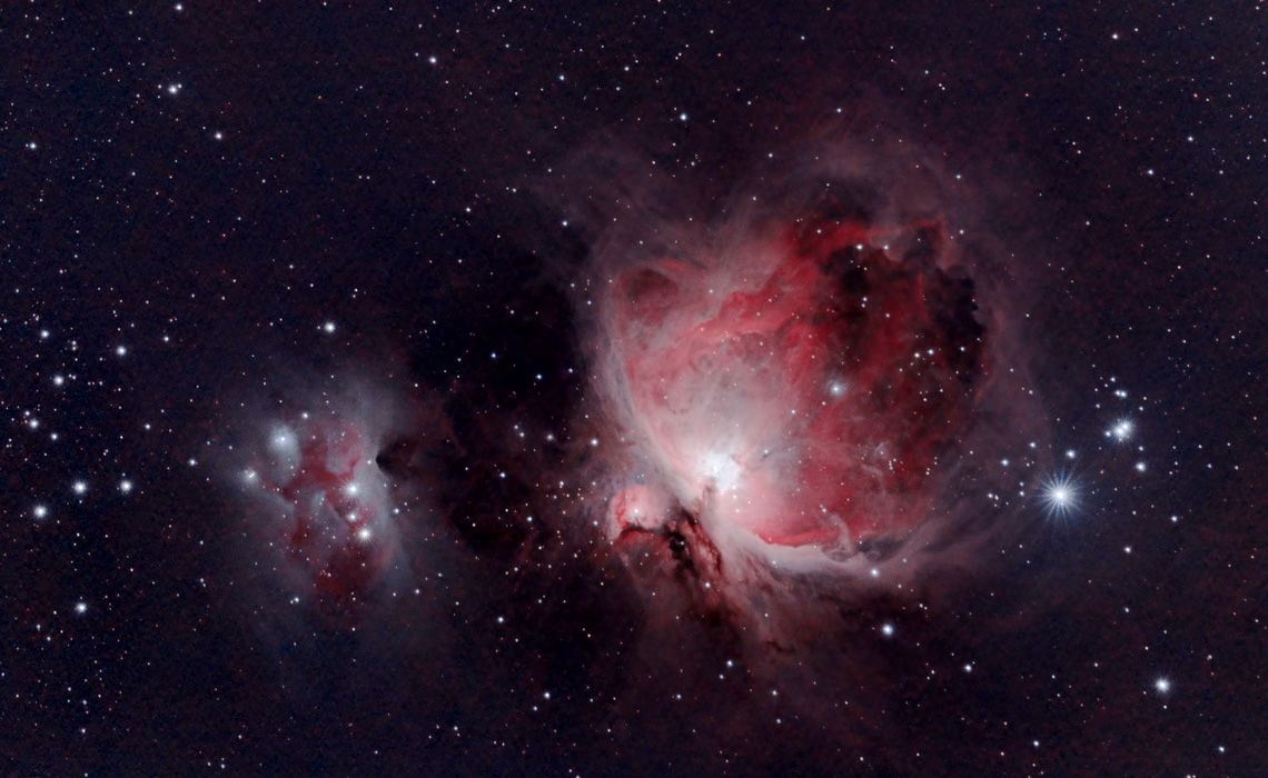 And yet, there was something not quite right with it all. I had to really take the data to the absolute extreme limits to bring out what I did in the image above. It was the most challenging image I’d created, and is probably still at the top of my list of most challenging images. I felt that it shouldn’t be that difficult. I had to reprocess several times before I finally managed to bring out all the structure in the right way. I had to obliterate a lot of finer structure and detail in the IFN to make it show up. I had seen more incredible images of the same region…deeper, more detailed, more brilliant. Something was missing in the way I was doing things, and I couldn’t quite figure it out. By the time I finally created the image above, I was already imaging Orion Nebula again. It felt like I’d come full circle, however it was barely more than 8 months since I’d first started imaging, less than 8 since I’d created my original Orion Nebula image. Thanks to the Pleiades image, I knew that to go deep like I wanted to, to bring out all the faint dusty detail, I needed to get a lot of light frames. At least 200 of them, and at four, give, eight minutes per sub, it was going to take a long time to do so. I started imaging Orion Nebula near the beginning of October, very early in the morning after it rose over my trees. While I waited to gather enough data to do what I wanted, I reprocessed my original Orion Nebula image, and managed to bring out some more faint nebula (as seen above). It was late November when I finally produced the following image: