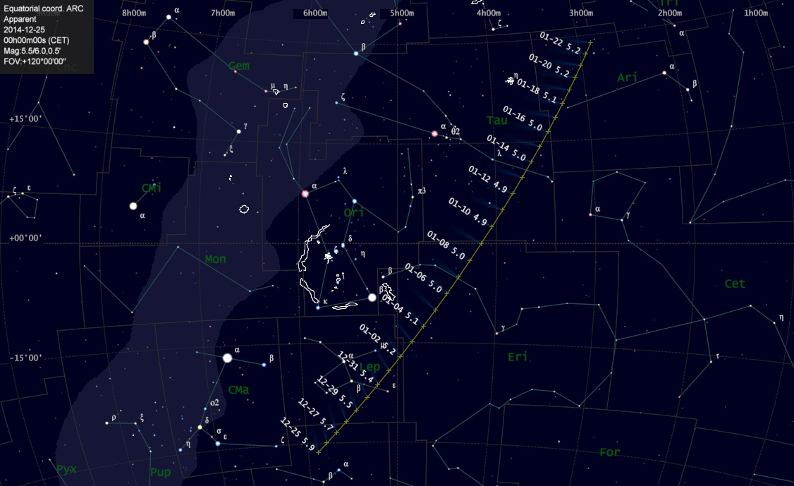 This comet is taking a path north and west of Orion, past Taurus and the Pleiades (I’d LOVE to get a shot of this near the Pleiades, if I have the opportunity! Hoping the weather cooperates for that! :D) For those who wish to observe this comet on their own, here is it’s path: