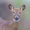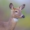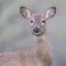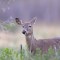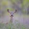 If it hadn’t been for a buck that came prancing up with the velvet-covered stubs of his new antlers, she might well have come right up for a kiss. 😉 The buck, however, pranced up…gave me this lazy glance, then glanced at the young doe and gave her a huff and a snort, then a quick, short stomp, and the two bounced off towards the other side of the field. I guess he was telling her to leave the poor little human creature alone? Well, a couple of minutes later she was back, not to be deterred from her investigation into the strange long-snouted creature sitting there in the field. 😀 She kept waving her head back and forth, sniffed the air, and repeatedly got within my minimum focus distance before getting a little too shy and pranced off a short distance again.