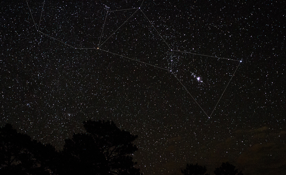 The “Axis of Nebula” in the constellation of Orion. Spanning from M78 in the upper left, through Flame and Horse Head nebulas in the center, down to M43 and Orion Nebula (M42) in the lower right.
