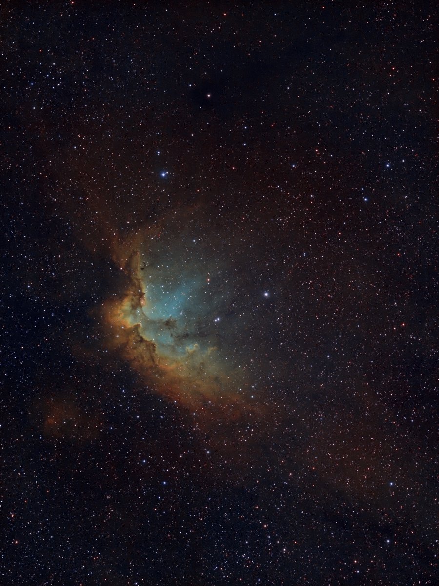 You may notice that your image still has a color cast in some areas, as in this example of Wizard nebula. This can occur when one channel, such as Ha here, is still much stronger than the others. Faint details are picked up in areas that are not yet picked up to a sufficient level in the other channels. This results in those channels being naturally weaker, allowing the dominant channel to exhibit most strongly in the color(s) it is combined into. The image here exhibits more green as Ha is most intense in most of these areas. The best solution to this kind of problem is to acquire more data in the weaker channels. However there are processing techniques that can be used, such as selective hue adjustments, that can produce a more balanced result (more on these in other articles):
