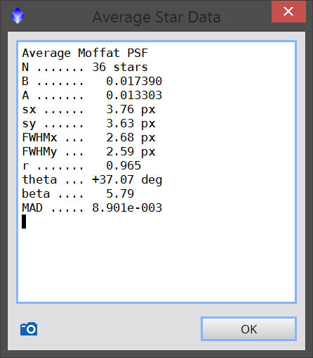Once you have selected your list of stars, you want to generate the PSF. You can do this one of two ways. You can click the blue camera icon on the toolbar in DynamicPSF to simply generate the model. Alternatively, you can click the button next to it with the summation icon. This will display the specifications of the average of the selected stars, and is a useful way to quickly check the statistical model that your PSF will represent. The key things I look for in most of my images, which generally have pretty round stars, are a high r (aspect ratio) and a beta (β) that is around 5. You may need to figure out which values represent ideals for your own imaging system, however a high r and a medium β are good things to aim for when trying to optimize your subs.