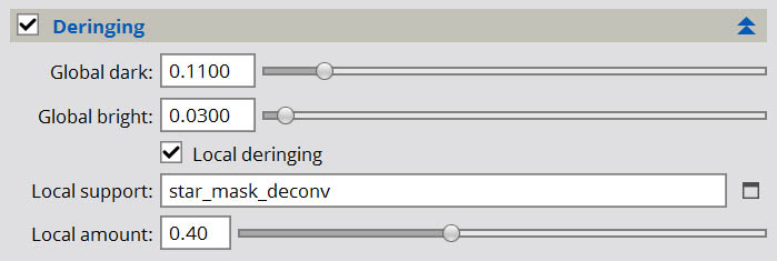 Enter another level of artifact avoidance features: Local deringing. This is an additional option in the Deringing section that allows us to add some explicit “localized” support for the stars via a star mask image. With local support added, two things will happen. The increased deringing that occurs as a result of reducing the global dark setting will be (ideally) eliminated, or at least reduced, and sadly the amount of deconvolution applied to the rest of the image will diminish somewhat. The use of a local deringing support image can potentially allow the global dark setting to be reduced even further, however, which would in turn allow stronger deconvolution of the image details. Again, it’s a matter of finding a balance point.