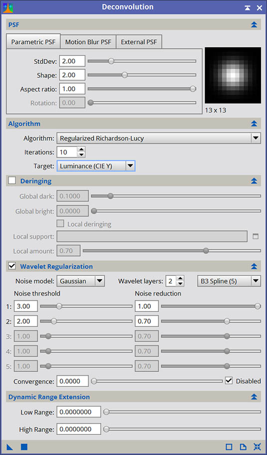 With a solidly well-modeled PSF in hand, we can not get down to the business of actually deconvolving our image. For this, we use the Deconvolution process in PixInsight. This is a non-dynamic process that allows you to configure a PSF (synthetic of two types, or from an external PSF model image), choose and configure a deconvolution algorithm as well as configure countermeasures for potential artifacts, and optionally expand dynamic range of the image to avoid clipping as a result of the deconvolution process. These settings are distributed throughout the five sections of DynamicPSF: PSF, Algorithm, Deringing, Wavelet Regularization and Dynamic Range Extension. Intriguingly, the two least used sections of this tool, Regularization and Dynamic Range expansion, are two of the most important in my opinion. Regularization in particular is one of the key focuses of this article.