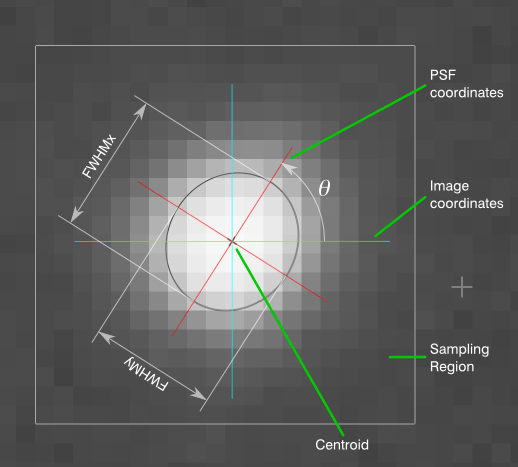 A small indicator will be rendered around each selected star. These indicators, called PSF Coordinates, are actually quite useful, as they visually indicate the nature of the stars. In the above image, you can see three selected stars. The one near the top is round with no obvious rotation. The highlighted green one is also mostly round, but has a rotation factor (which can only be the case if the width of the star is different than the height). The one near the bottom is clearly elliptical rather than round, and would be a good candidate for removal if it does not generally represent the PSF of the whole image. (Note also that the star at the bottom may have a faint companion star within the box, which could very well be the reason the PSF model is elliptical rather than round…make sure your selected stars are isolated!) A more detailed breakdown of the PSF Coordinate is shown below: