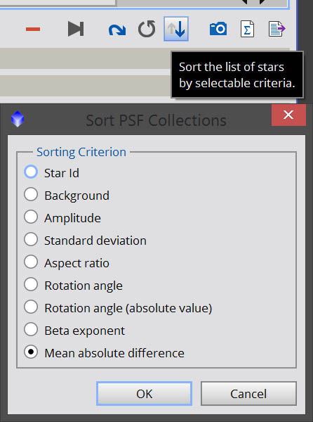 Once you have chosen enough stars in the image, you will want to “cull” the list. This will eliminate outliers that don’t necessarily represent the true PSF of the image, allowing you to generate an accurate model. As mentioned above, remove any Gaussian and Moffat10 stars. Since Lorentzian represents very sharp stars, you probably want to eliminate any of those as well, and maybe also eliminate Moffat15 (1.5) stars as well. If the majority of your stars are Moffat15 or Lorentzian, then my recommendation here is don’t deconvolve! You already have sharp data. After removing the model type outliers, it’s time to remove other outliers. Click the Sort Stars button in the toolbar in the DynamicPSF window, then select MAD (Mean absolute difference) from the list of sorting criterion.