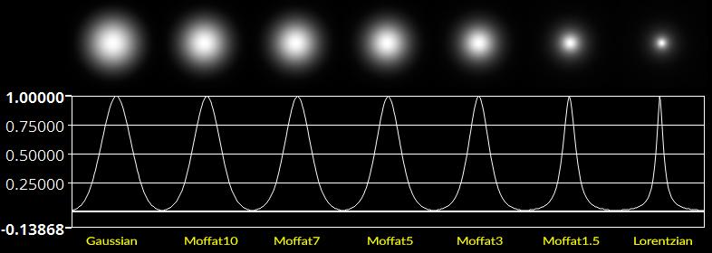 Not all stars will actually conform to a Gaussian model. For those unfamiliar with what this means, think of a classic bell curve…a curve that is “peaked” in the middle, and falls off with a bell shaped outline as you move away from the middle. Some stars, often most stars, may be better approximated by a Moffat or Lorentzian model. Saturated or nearly saturated stars will generally have a Gaussian form: less peaked, flatter, more rounded. If you have very good seeing and dark skies, your unsaturated stars may even have a Lorentzian form: narrower, taller, more sharply peaked. These are star profiles, and this is an important aspect of properly modeling the PSF. Here is a chart of artificial star spots generated using the various geometric models, along with their two dimensional profiles, to help you visualized the differences between these functions…between these PSFs: