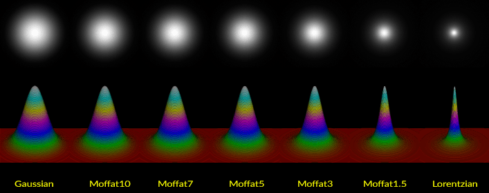 Unsaturated stars will often conform to Moffat, which is more peaked than Gaussian, but less peaked than Lorentzian. These models “fill the gap” between softer Gaussian stars and sharper Lorentzian stars. Moffat stars have an additional exponent called beta or β, that controls the shape of the model. Most unsaturated stars in an image will usually be best approximated by a Moffat model, however the model can range from nearly Lorentzian in form (Moffat1, β=1) to nearly Gaussian in form (Moffat10, β=10). Many very bright, nearly saturated stars that have entered the non-linear range of the sensor may start to fatten/flatten into Moffat10 shapes, is basically the same as Gaussian. It is preferable to reject all Gaussian and Moffat10 stars from a PSF model generated from star samples in your image. Below is another visualization of the above star models, only in three dimensions, which might help you further visualize an image in an alternative context: