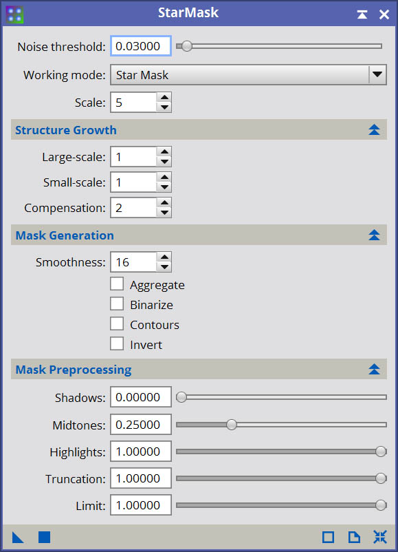 To enable local deringing, you need to create a star mask. The resulting star mask image will not actually be used as a mask, instead you will reference it in the local deringing area of the Deringing section of Deconvolution. Generating the star mask is pretty easy. I use the following settings for most of my images, and tweak as necessary until the star mask does it’s job and properly supports local deringing around the stars. This requires some trial and error, however generally speaking only a few cycles are required to generate an ideal mask.